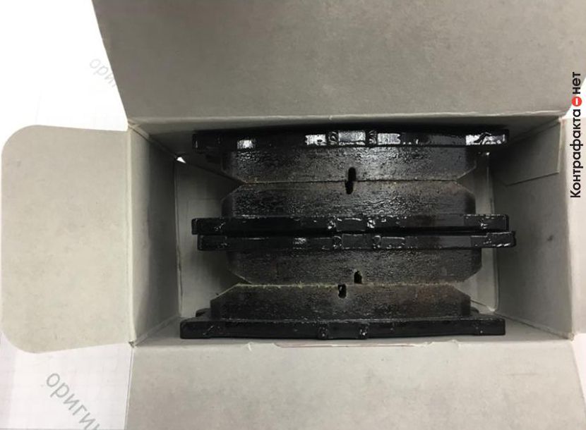 Выявленные отличительные признаки подделки: Отличается полиграфия упаковки. Отличается шрифт и полиграфия стикера. Боковые технические углубления сделаны по-разному. Отсутствует маркировка краской на железной части колодок. Более выраженные углубления на железной части колодок. Визуально отличается точечное нанесение маркировки на железной части колодок. Визуально отличается оттенок состава фрикционного материала.