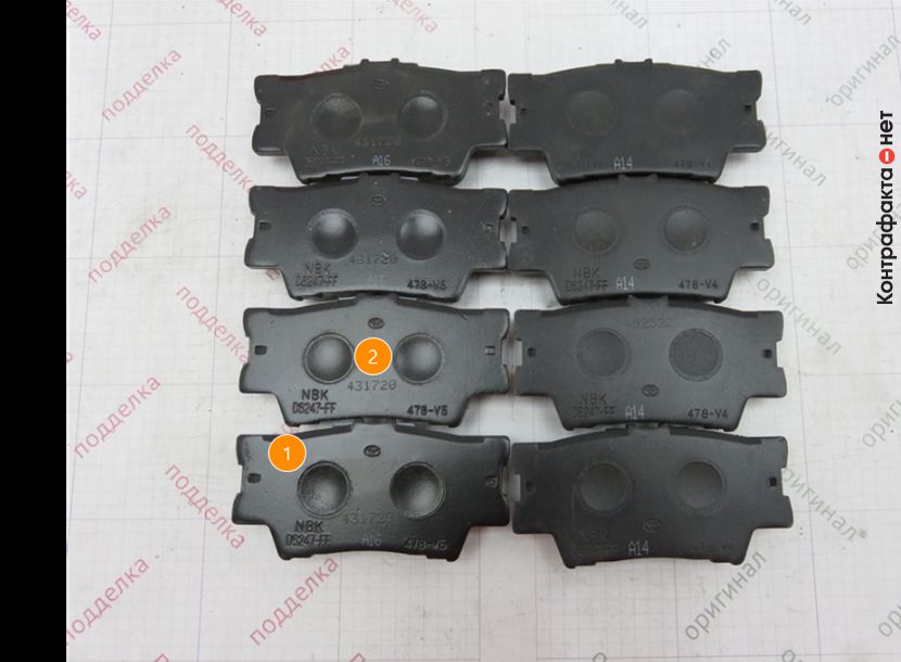Как отличить подделку от оригинала: Отличается шрифт, полиграфия. Буквы нанесены не ровно, отличается шрифт. Отличается глубина пропила отводного канала. Отличается оттенок состава фрикционного материала. Отличается окрас. Отличается место размещение маркировки логотипа и заводского номера. Более выражены следы пресс формы. Не равномерный интервал между символами маркировки. Отличается вес.